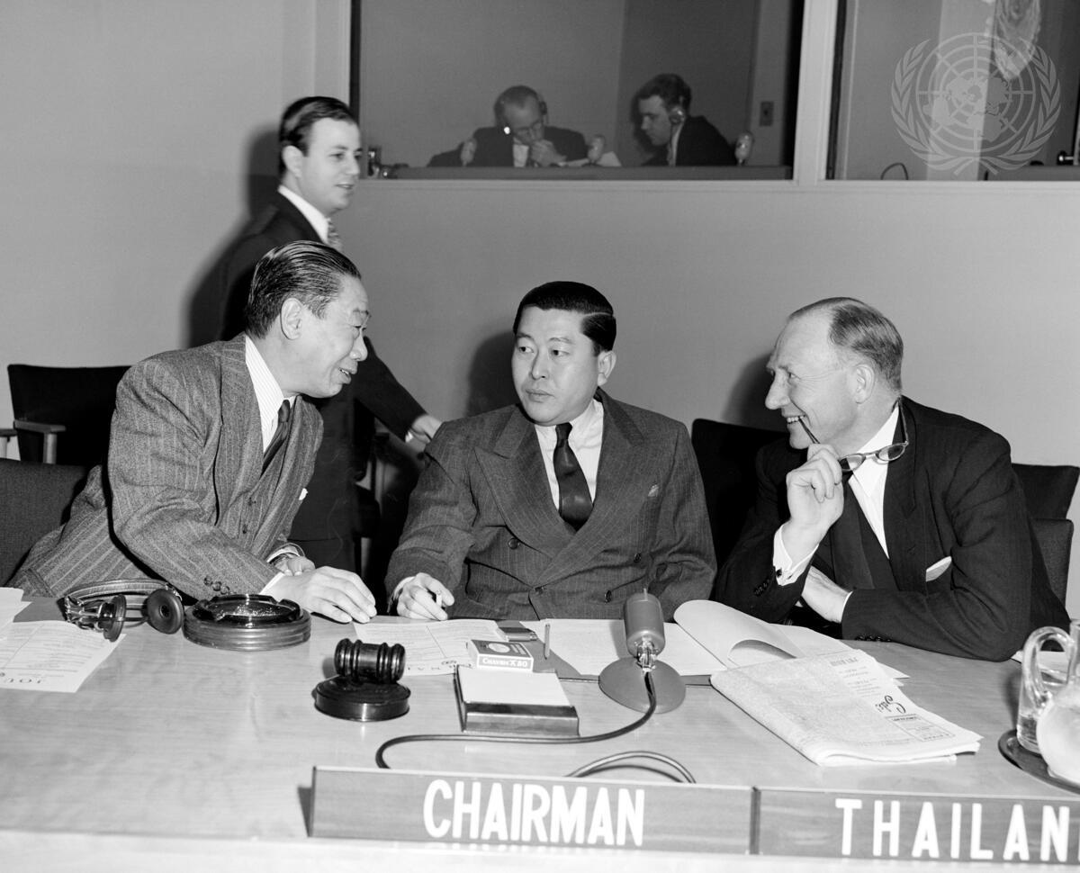 This picture, taken after the meeting, shows the Chairman of the Committee, Mr. Thanat Khoman (center) of Thailand, conversing with Mr. Victor Hoo (left), Assistant Secretary-General of the U.N. in charge of Trusteeship and Information from Non-Self-Governing Territories, and Mr. Heinrich A. Wieschhoff, of the U.N. Trusteeship Division, Secretary of the Committee.