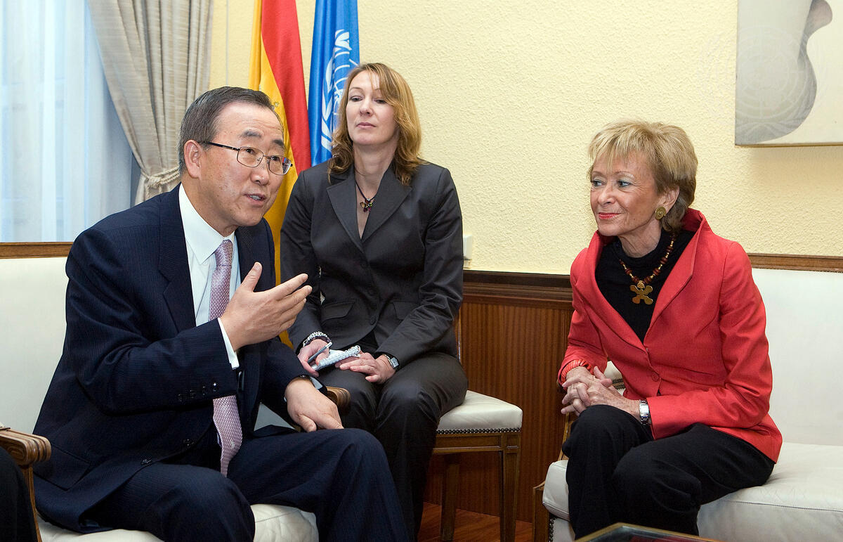 Secretary-General Ban Ki-moon (left) in a meeting with María Teresa Fernández de la Vega (right), Vice-President of the Government Spain.