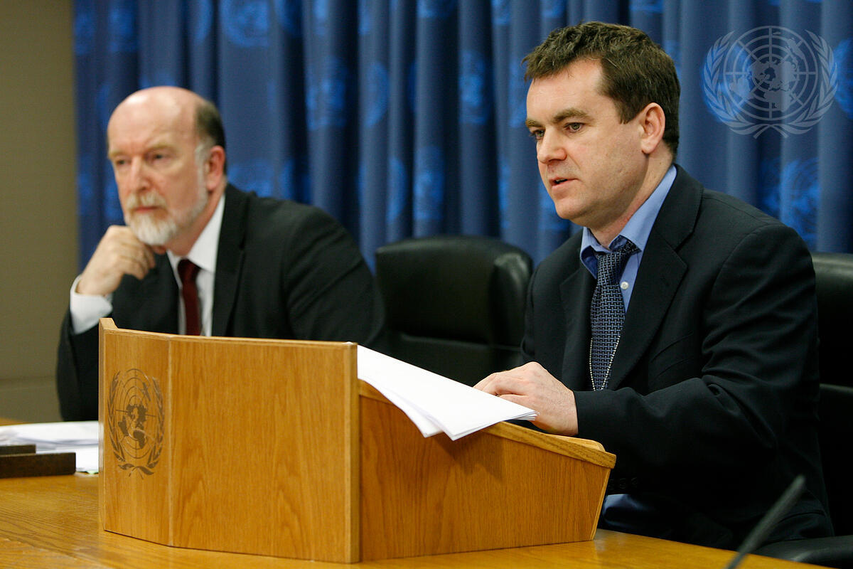 Brendan O'Mally (right), author of the UN Education, Scientific and Cultural Organization (UNESCO) global study entitled ""Education Under Attack"", flanked by Mark Richmond, Director of the Division for the Coordination of United Nations Priorities in Education for UNESCO, addresses a press conference on the new publication, at UN Headquarters in New York.
