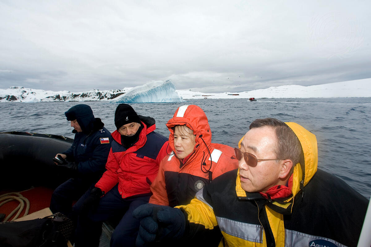 Secretary-General Ban Ki-moon (right), accompanied by his wife Yoo Soon-taek (second from right), on a boat-ride to see first-hand the effects of climate change on the melting glaciers.