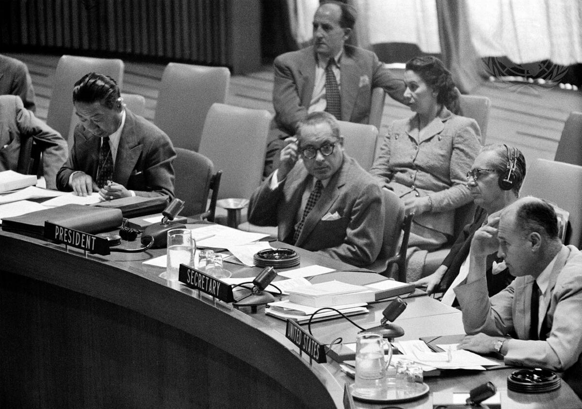 Dr. Miguel Rafael Urquia (right), of El Salvador, President of the Trusteeship Council; and Dr. Victor Hoo, Assistant Secretary General of the U.N. in charge of Trusteeship and Information from Non-Self-Governing Territories, photographed during a meeting of the current session of the Council.