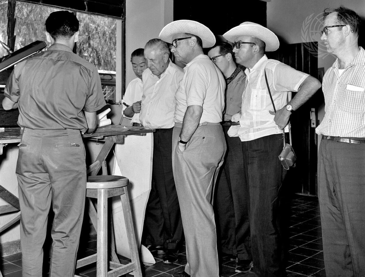 A Mexican engineer (back to camera) explains methods of field airborne compilations to the following UN officials (left to right): Mr. Victor Hoo, Commissioner for Technical Assistance, Mr. Paul G. Hoffman, Managing Director of the UN Special Fund, Mr. Roberto M. Hurtematte, Associate Managing Director of the UN Special Fund, Mr. Carlos Vejega, Deputy Director of UN Technical Assistance Board and Dr. Miguel Albornoz, Director of the Special Fund Prograrmne in Mexico. April 1963.