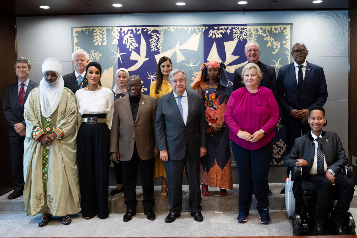 Secretary-General António Guterres (centre right) meets with the Sustainable Development Goals Advocacy Group. From left to right: Jeffrey Sachs, Emir of Kano, Richard Curtis, Sheikha Moza bint Nasser, Alaa Murabit, Nana Addo Dankwa Akufo-Addo, Dia Mirza, Mr. Guterres, Hindou Ibrahim, Erna Solberg, Paul Polman, Forest Whitaker and Edward Ndopu.