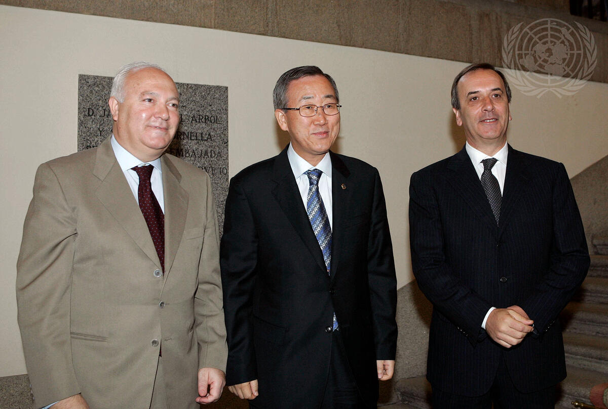 Secretary-General Ban Ki-moon (centre) meets with Miguel Angel Moratinos (left), Minister for Foreign Affairs of Spain; and José Antonio Alonso Suárez, Minister for Defence, at the Palacio de Santa Cruz in Madrid, Spain.