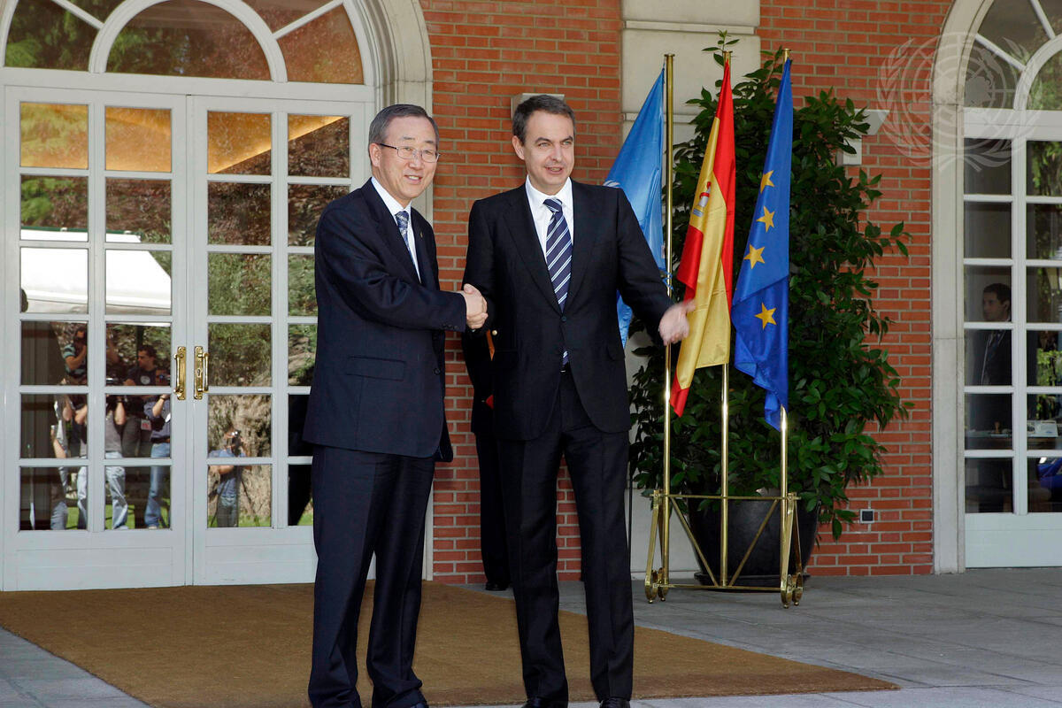 Secretary-General Ban Ki-moon (left) is received by José Luis Rodríguez Zapatero, President of the Goverment of Spain upon arrival, at Moncloa Palace in Madrid, Spain.