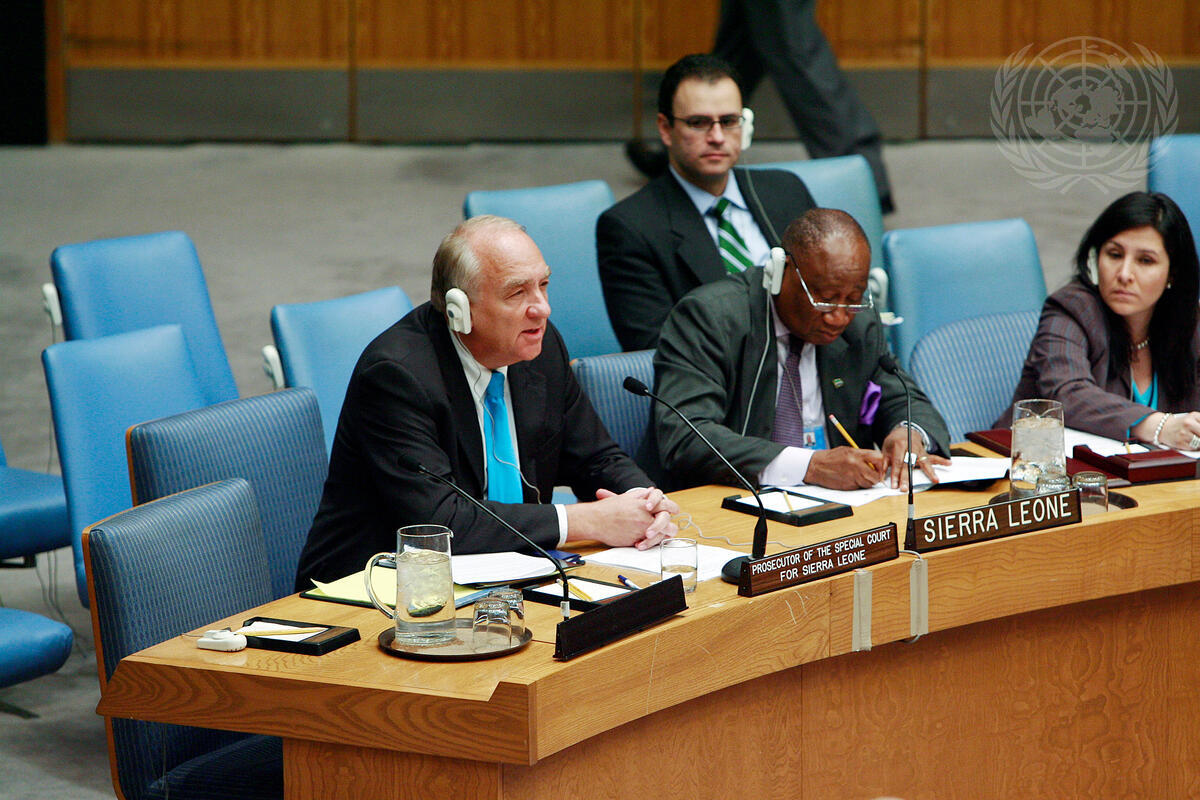 Stephen J. Rapp (left), Prosecutor of the Special Court for Sierra Leone, briefs the members of the Security Council on the situation in Sierra Leone, at UN Headquarters in New York.