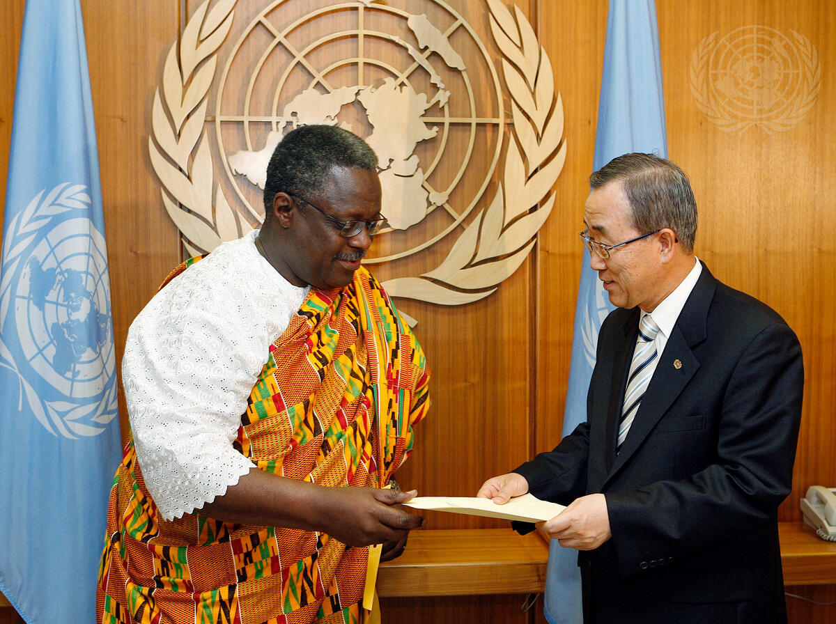 Secretary-General Ban Ki-moon (right) receives the credentials of Leslie Kojo Christian, new Permanent Representative of Ghana to the United Nations, at UN Headquarters in New York.