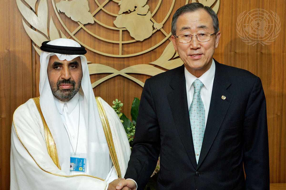 Secretary-General Ban Ki-moon (right) meets with Mohammed bin Eid Al-Thani, Chairman of the Eid Charity Association of the State of Qatar , at UN Headquarters in New York.