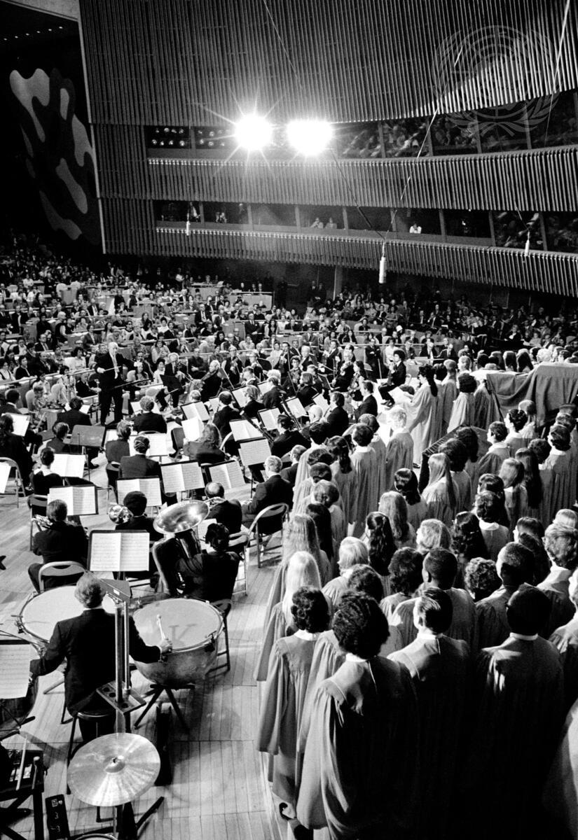 The 1971 United Nations Day concert was held in the General Assembly Hall at United Nations Headquarters this afternoon. ""Hymn to the United Nations"", a new composition by Spanish cellist and composer Pablo Casals, with a text by the American poet W. H. Auden, was commissioned by UN Secretary-General, U Thant, to mark the twenty-sixth anniversary of the United nations, was performed by the orchestra of the Festival Casals, with the United Nations singers and the chorus of the Manhattan School of Music, Under the direction of Maestro Pablo Casals.