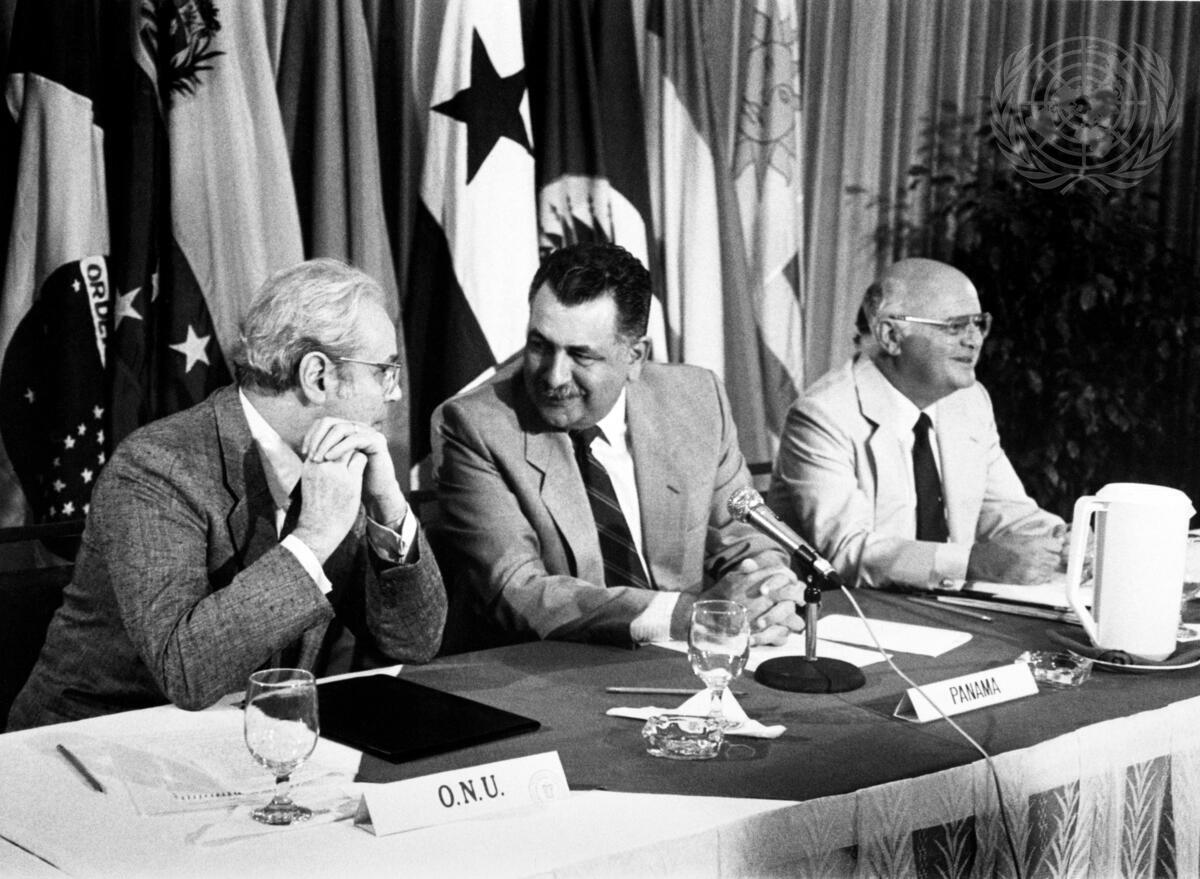 From left to right are: Secretary-General Javier Perez de Cuellar, Jorge Abadia Arias, Foreign Minister of Panama, and Joao Clemente Baena Soares, Secretary-General of the Organization of American States (OAS).