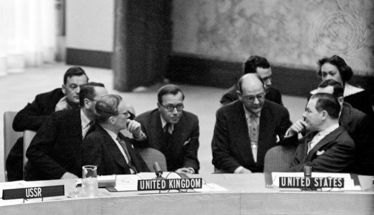 This picture, taken during the meeting, shows Sir Pierson and the members of his delegation, at left, and Mr. Henry Cabot Lodge, Jr., Permanent Representative of the United States, and the members of the American delegation at right.
