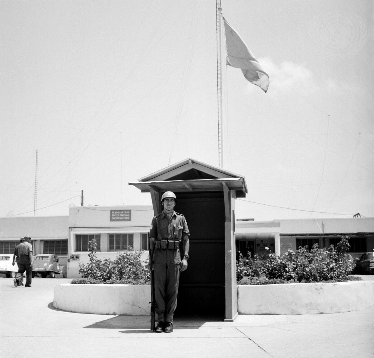 Photograph shows a member of the Yugoslav platoon on guard duty outside UNEF Headquarters.
