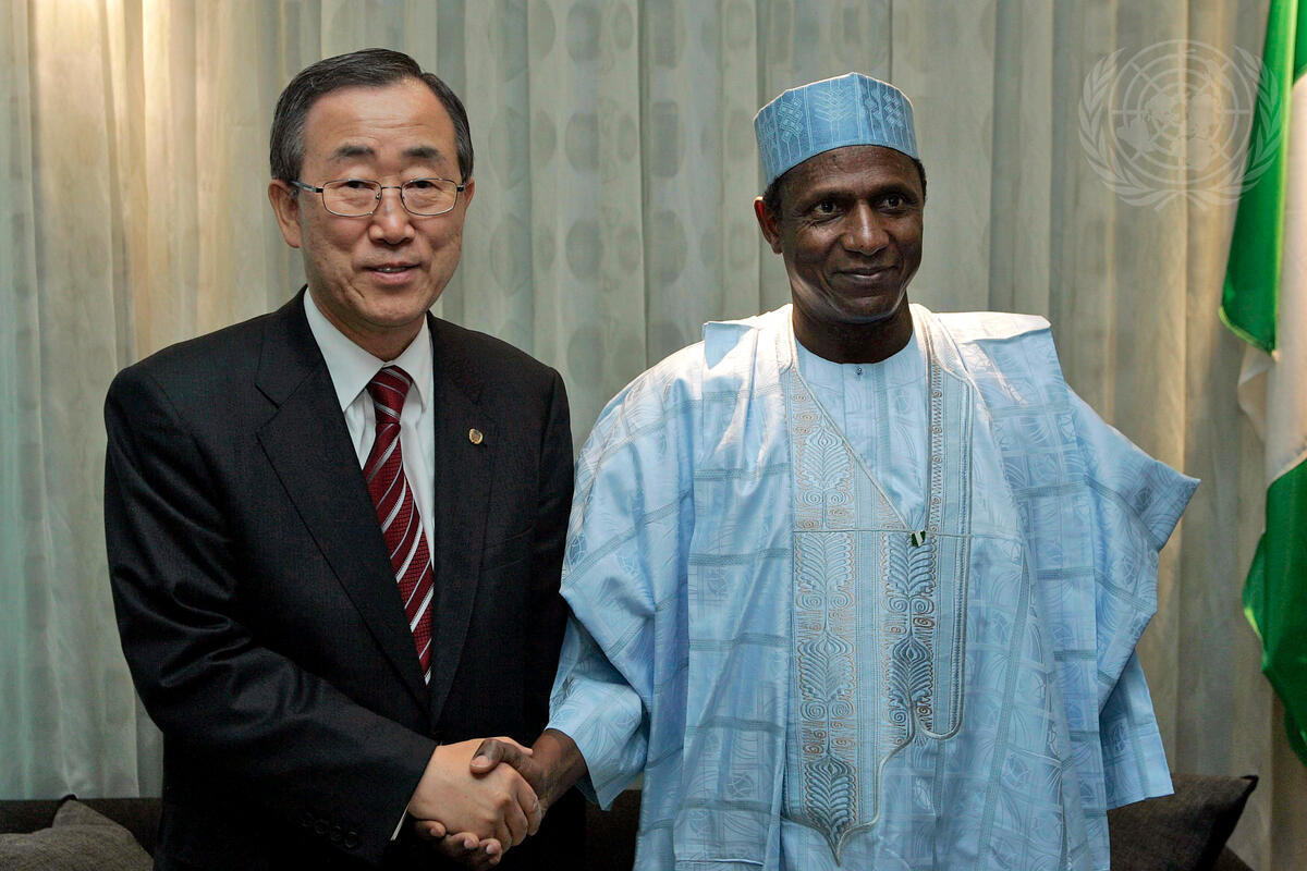 Secretary-General Ban Ki-moon (left) meets with Umaru Musa Yar'Adua, new President of Nigeria at the Intercontinental Hotel in Berlin, Germany.