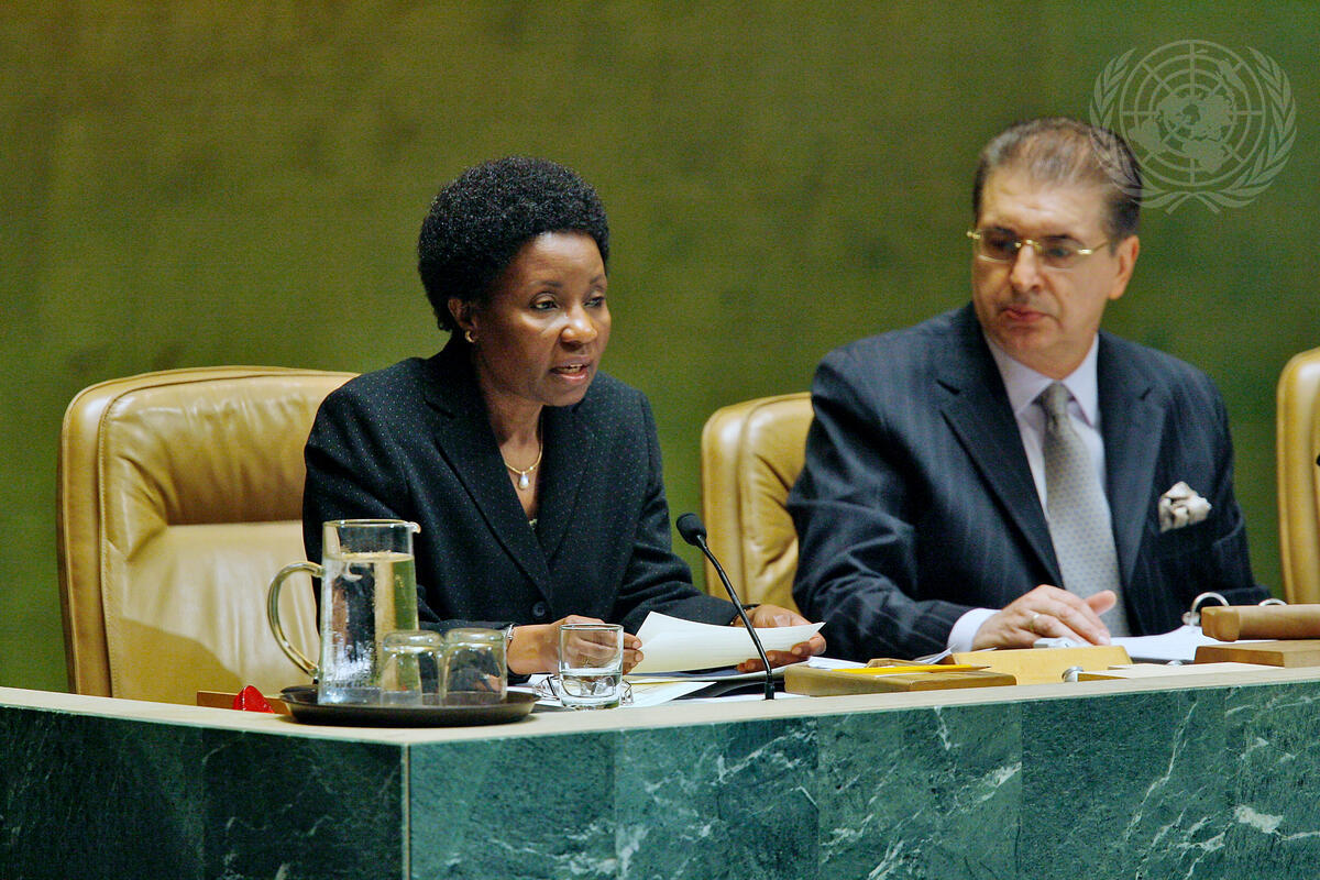 Deputy Secretary-General Asha-Rose Migiro (left) speaks during the General Assembly election of the president for its sixty-third session, as Srgjan Kerim, President of the sixty-second session of the General Assembly, listens.