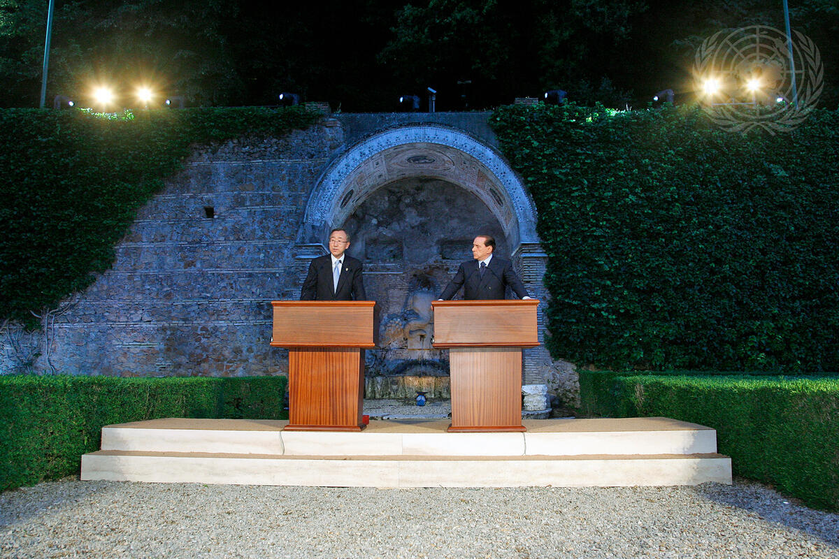 Secretary-General Ban Ki-Moon (left) addresses a joint press conference with Silvio Berlusconi, Prime Minister of Italy.