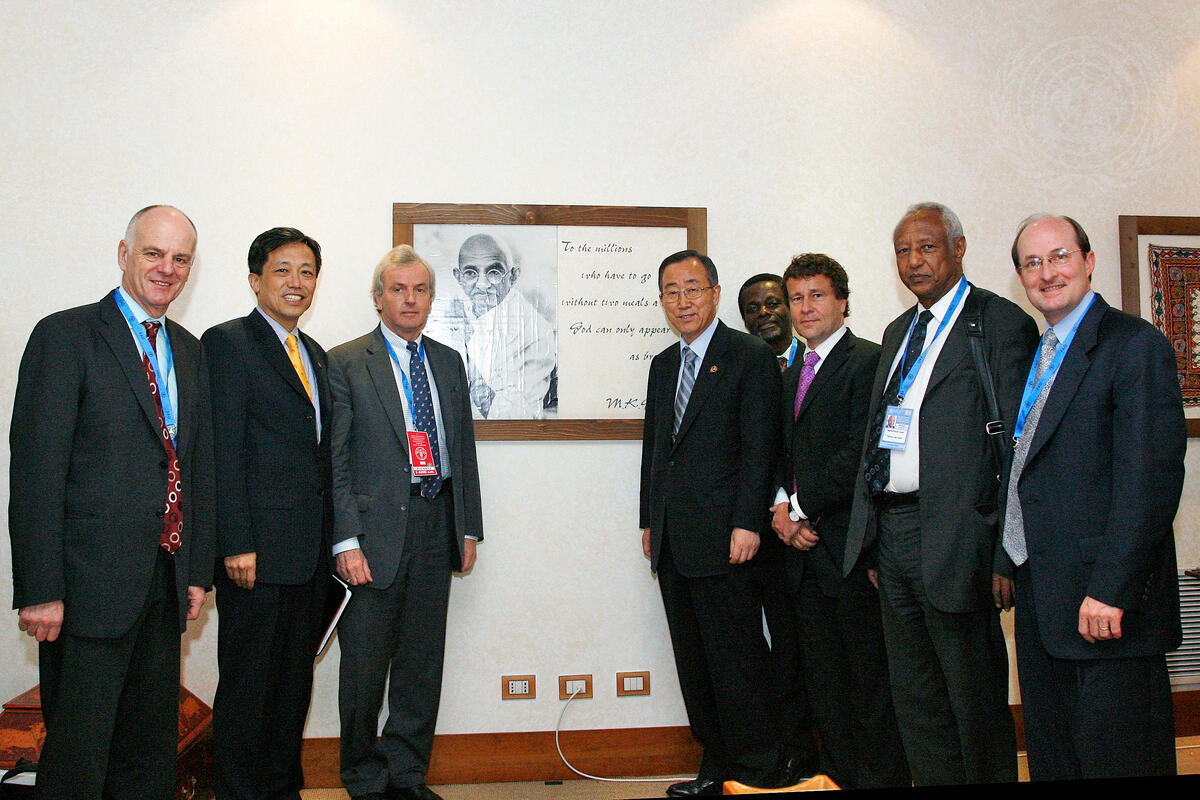 Secretary-General Ban Ki-moon (fifth from right) poses for a group photo with the members of his delegation to the High-Level Conference on the "" World Food Security: the Challenges of Climate Change and Bioenergy"", near a portrait of Mahatma Gandhi, with the inscription: ""the millions who have to go without two meals a day God can only appear as bread."" M.K. Gandhi.