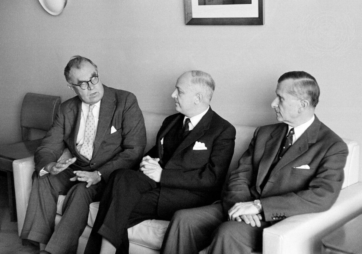 Seen in this photograph taken at United Nations Headquarters today are (left to right): Sir Leslie Munro (New Zealand) President of the Twelfth Session of the General Assembly; Mr. Christian Pineau, French Foreign Minister and head of the French delegation to the United Nations; and Mr. Guillaume Georges-Picot, French Permanent Representative to the United Nations.