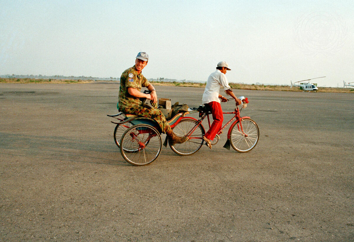 An Australian soldier belonging to the Force Communication Unit takes a cyclo to board an UNTAC helicopter in Phnom Penh. March 1993.