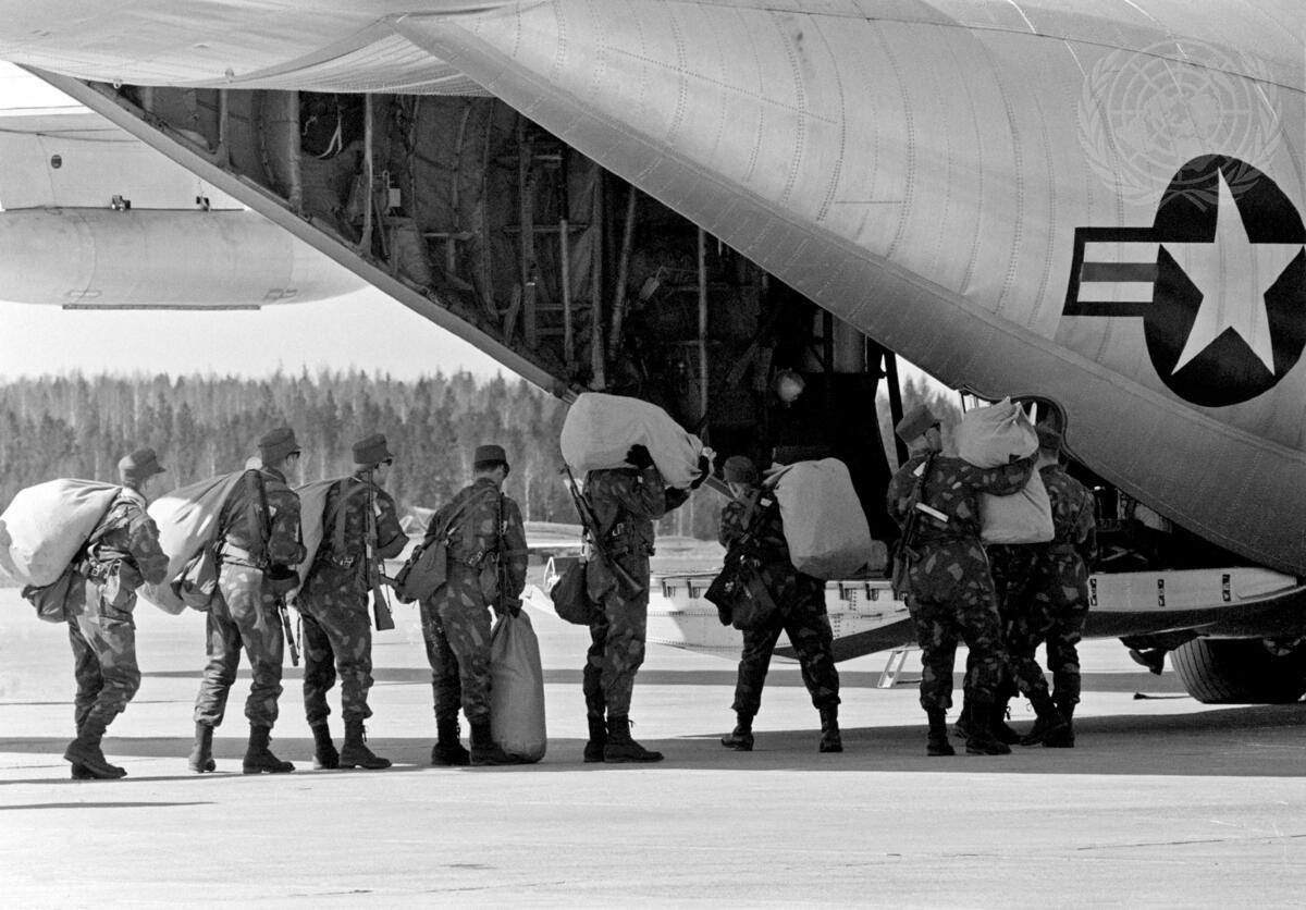 Members of the Finnish contingent which will serve with the United Nations Peacekeeping Force in Cyprus (UNFICYP), are seen boarding an aircraft of the United States Air Force at Seutula Airport in Helsinki. The main body of the Finnish contingent is due to arrive in Nicosia, Cyprus between 25 April and 1 May. [Exact date unknown]