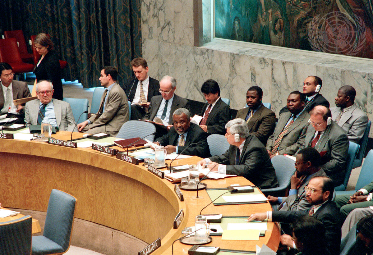Security Council President Denis Dangue Rewaka (Gabon) presides over a meeting at which the Council unanimously adopted Resolution 1243 (1999), extending the mandate of the United Nations Disengagement Observer Force (UNDOF) for a further six months, to 30 November. The force was established to supervise a May 1974 agreement on the disengagement of Israeli and Syrian forces.