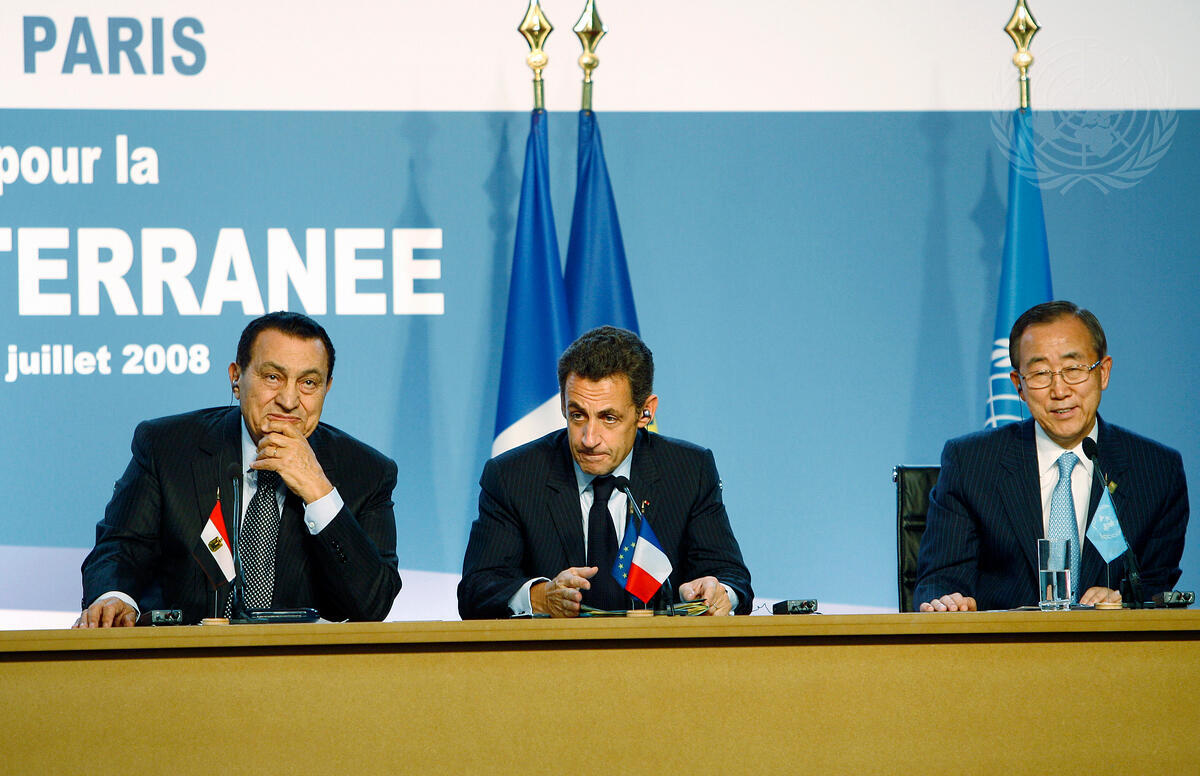 Secretary-General Ban Ki-moon (left) attends a joint press conference of Nicolas Sarkozy (centre), President of the Republic of France and Hosni Mubarak, President of the Arab Republic of Egypt.
