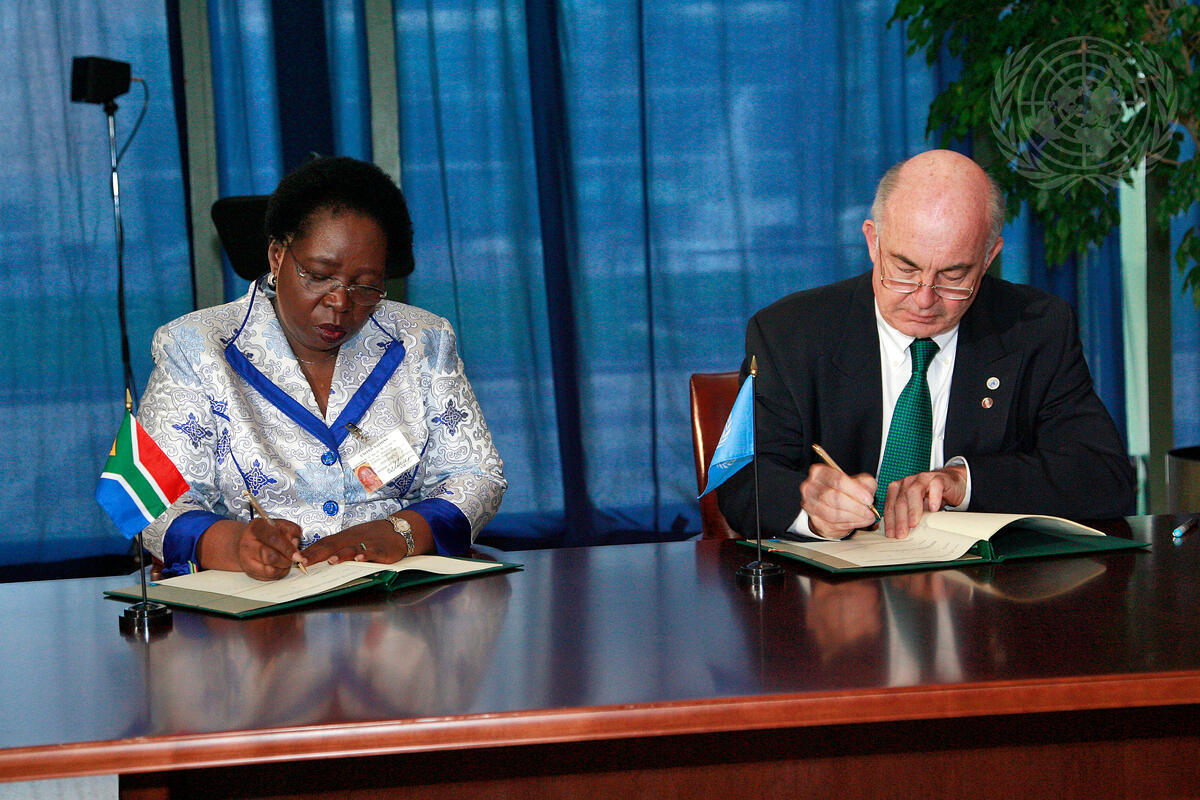 Kemal Dervis (right), Administrator of the United Nations Development Programme (UNDP); and Nkosazana C. Dlamini-Zuma, Minister for Foreign Affairs of the Republic of South Africa, sign a host country agreement, at UN Headquarters in New York.