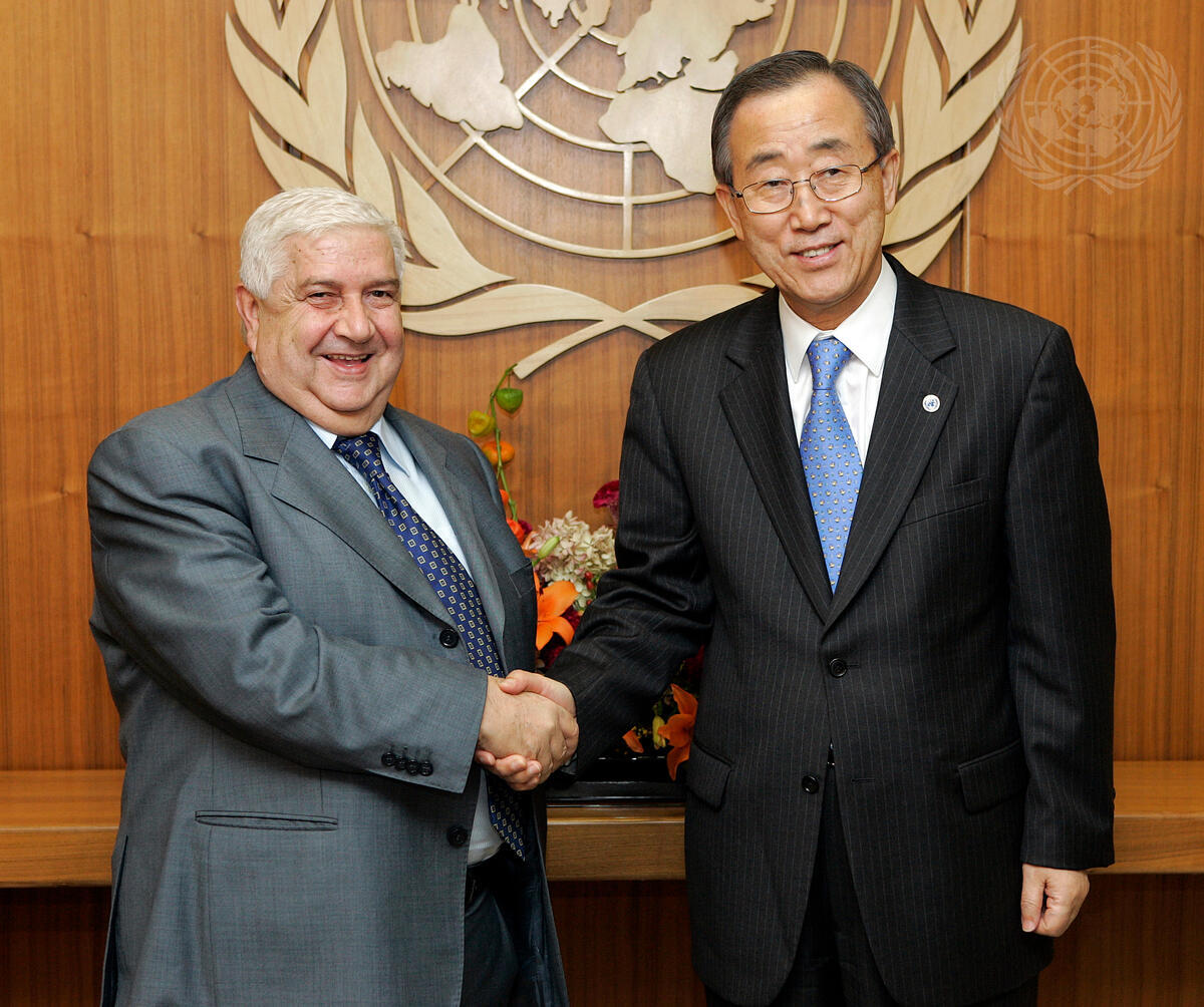 Secretary-General Ban Ki-moon (right) meets with Walid Al-Moualem, Minister for Foreign Affairs of the Syrian Arab Republic.