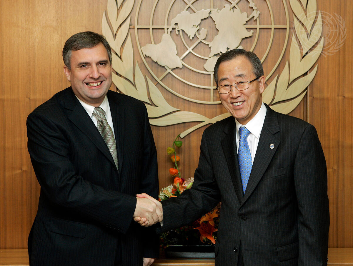 Secretary-General Ban Ki-moon (right) meets with Ivailo Kalfin, Deputy Prime Minister and Minister for Foreign Affairs of the Republic of Bulgaria.