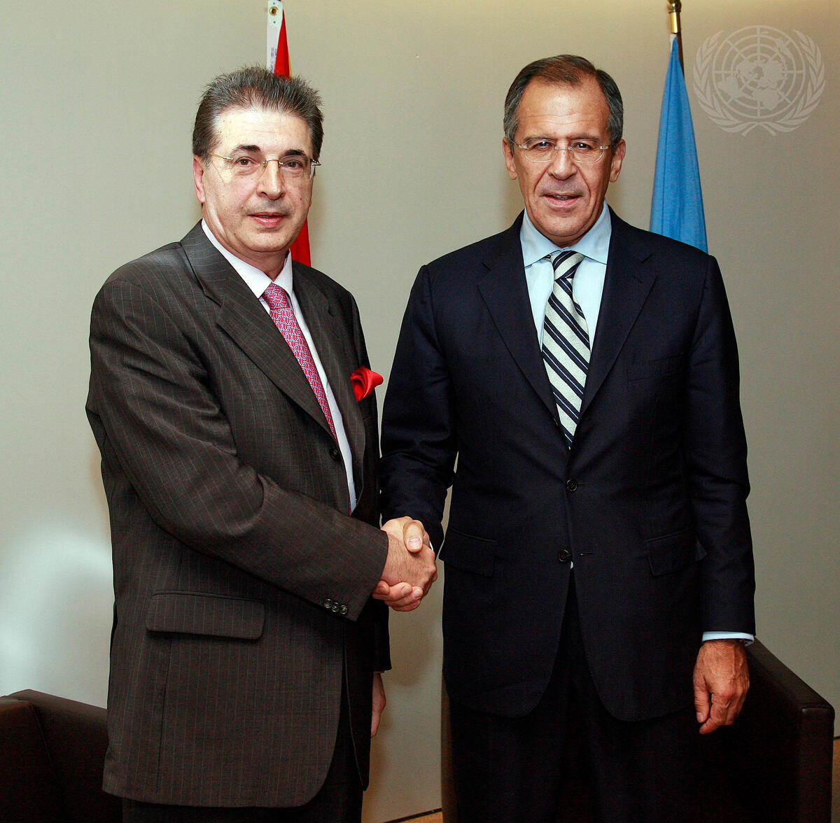 Srgjan Kerim (left), President of the sixty-second session of the General Assembly, meets with Sergey Lavrov, Minister for Foreign Affairs of the Russian Federation, at UN Headquarters in New York.