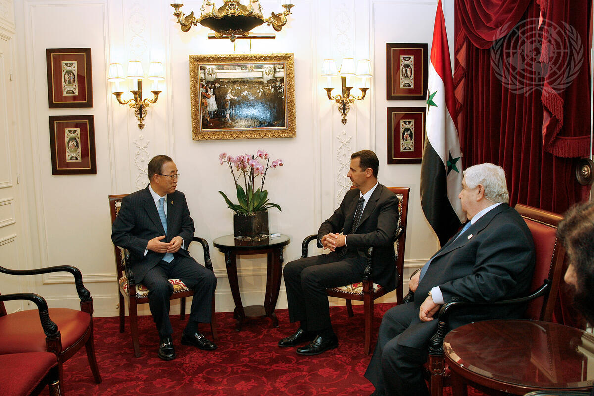 Secretary-General Ban Ki-moon (left) holds a meeting with Bashar al-Assad (centre), President of the Syrian Arab Republic.