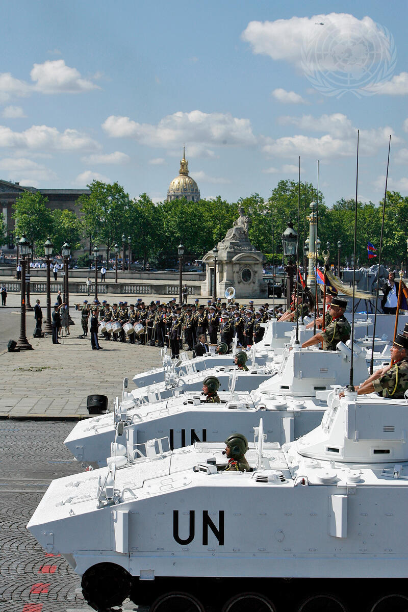 United Nations Peacekeepers participate in the Bastille Day Parade, in honour of the sixtieth anniversary of United Nations Peacekeeping Operations.
