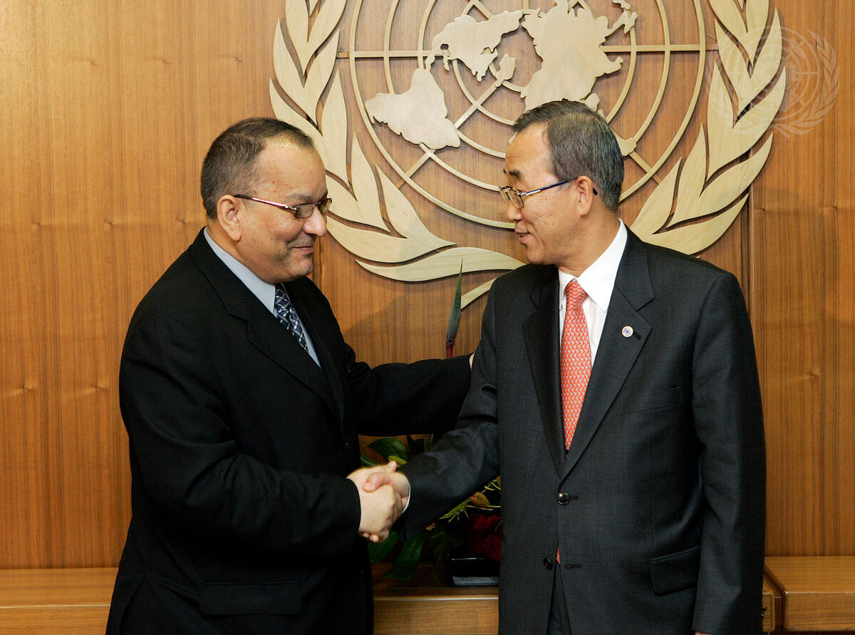 Secretary-General Ban Ki-moon (right) meets with Ahmad Allam-Mi, Minister for Foreign Affairs of the Republic of Chad.