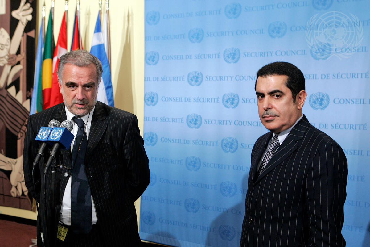 Luis Moreno-Ocampo (left), Prosecutor of the International Criminal Court (ICC), briefs journalists outside the Security Council chamber after Council's meeting on Sudan, at UN Headquarters in New York.