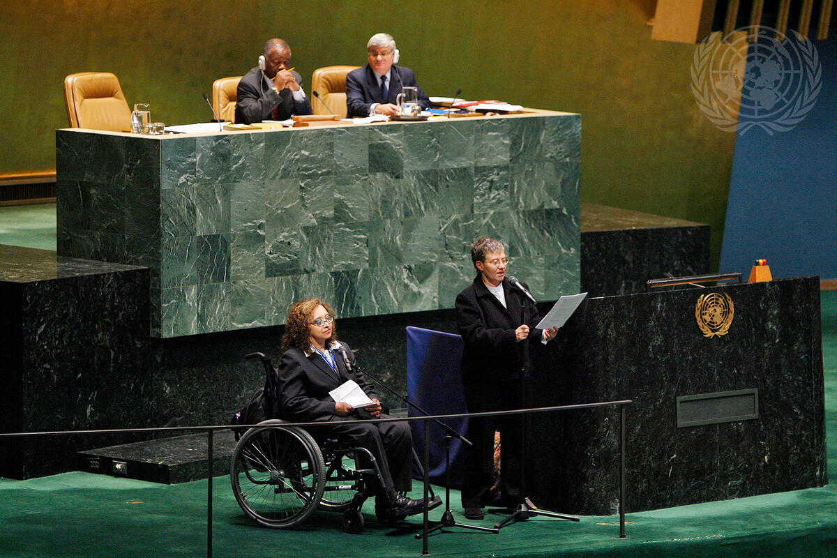 Tina Minkowits, from the World Network of Users and Survivors of Psychiatry, welcomes the adoption of the Convetion on the Rights of Persons with Disabilities by the General Assembly, at UN Headquarters in New York. At the podium with her, is Maria Reina, from Rehabilitation International.