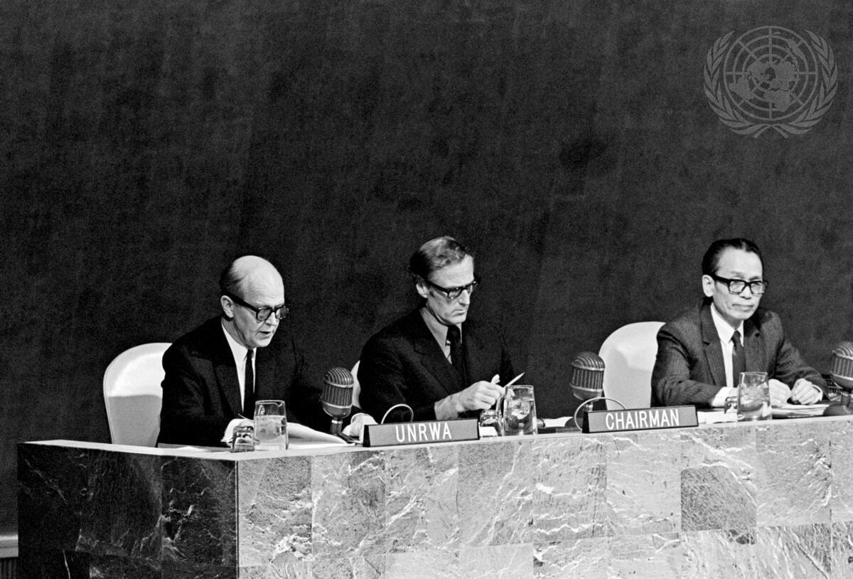 Seen here on the podium of the General Assembly Hall during the pledging conference, from left to right are: Laurence MICHELMORE, Commissioner-General of UNRWA; Syerker C. ASTROM (Sweden), Chairman of the Conference; and Feng-Yang CHAI, Committee Secretary.