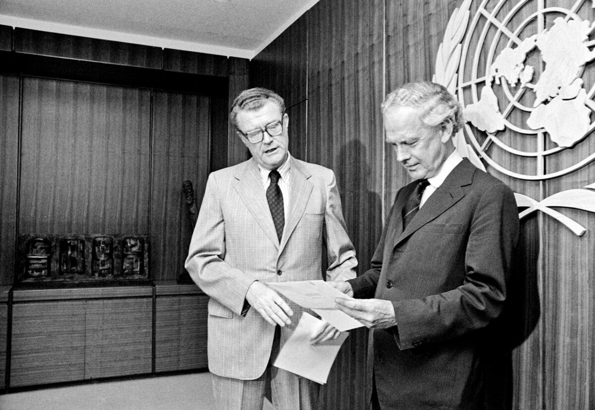 Ambassador W. Tapley Bennett, Jr., Acting Permanent Representative of the United States to the United Nations (left), presenting a cheque for $6 million as a special United States contribution to UNRWA, to Mr. Jan Van Wijk, Director, New York Liaison Office, UN Relief and Works Agency for Palestine Refugees in the Near East, on 11 July 1975.