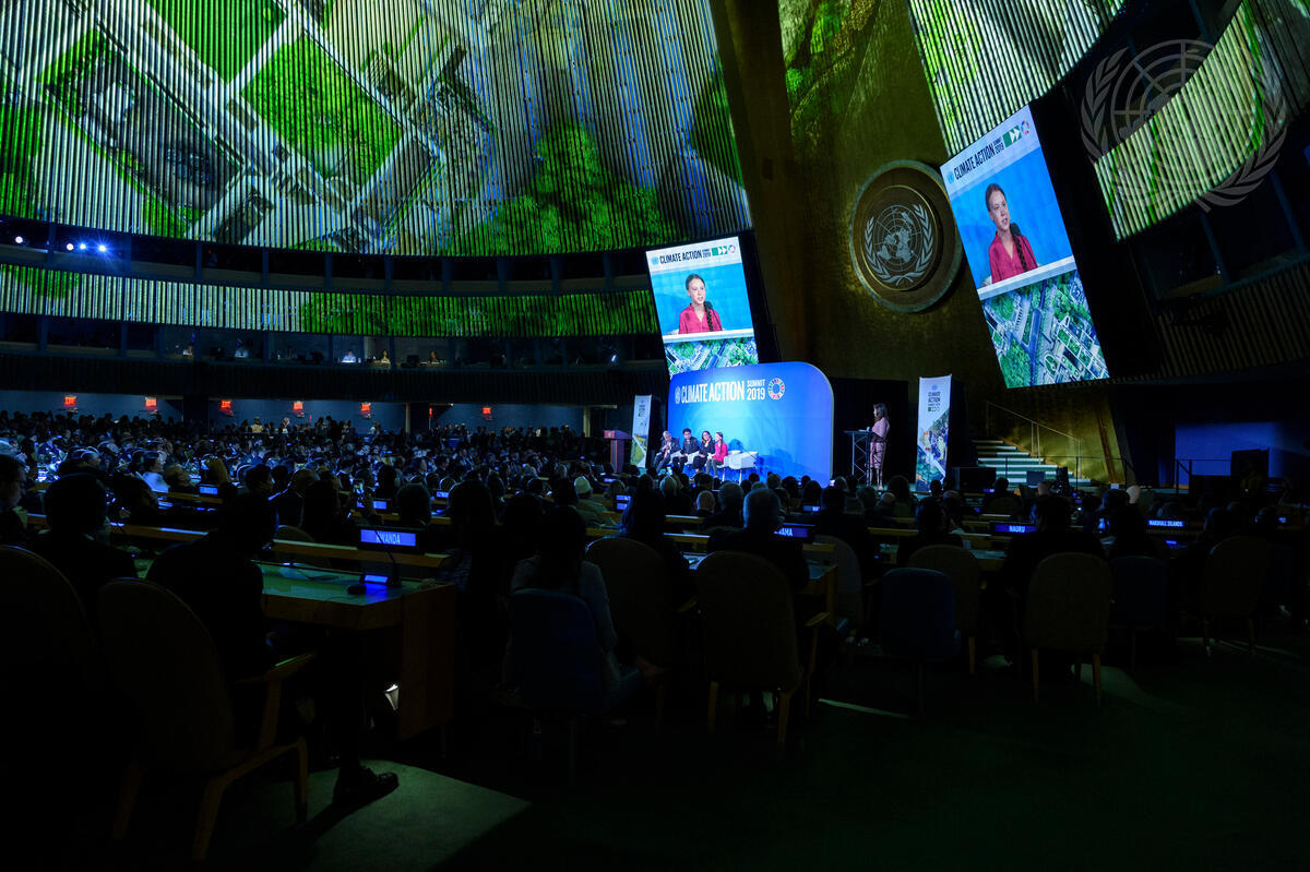 "Greta Thunberg (on screens and right at stage), Climate Activist, speaks at the opening of the UN Climate Action Summit 2019.