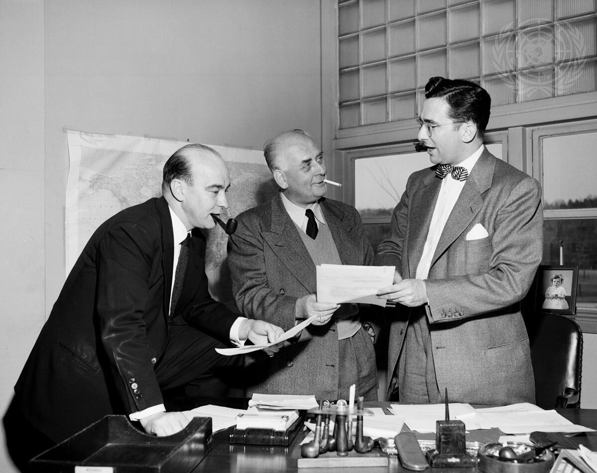 Mr. Adrian Pelt (center) with Mr. David Vaughan (left), Acting Secretary-General for UN Department of Conference and General Services, and Mr. Thomas Power (right), Principal Secretary to Libya Commission. Picture was taken in the latter's office immediately prior to Mr. Pelt's departure for Libya.