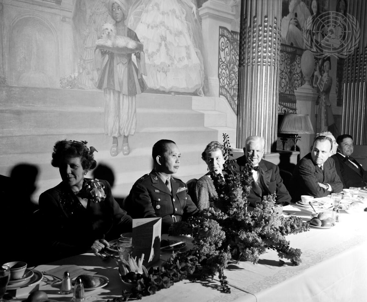 A dinner was held in honor of Philippine Chairman Brigadier General Carlos P. Romulo (second from left) on 26 May in the ballroom of the St. Francis. Seated at his right are Mrs. and Mayor Roger E. Lapham.