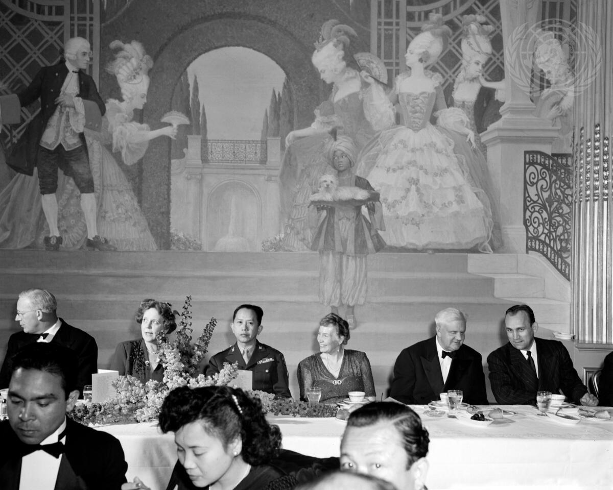 Philippine Dinner in honor of Chairman, Brigadier General Carlos P. Romulo on May 26, in the Ballroom of the St. Francis. Left to right: Gov. and Mrs. Earl Warren, Gen. Romulo, Mrs. Roger E. Lapham, Mayor Roger E. Lapham, Congressman Thomas.