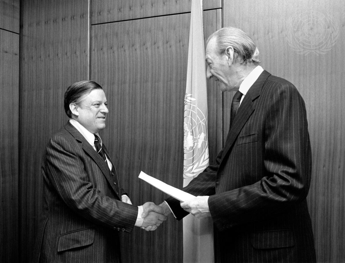 Paul J. G. Keating (left), the new Permanent Representative of Ireland to the UN, presents his credentials to Secretary-General Kurt Waldheim at UN Headquarters today.