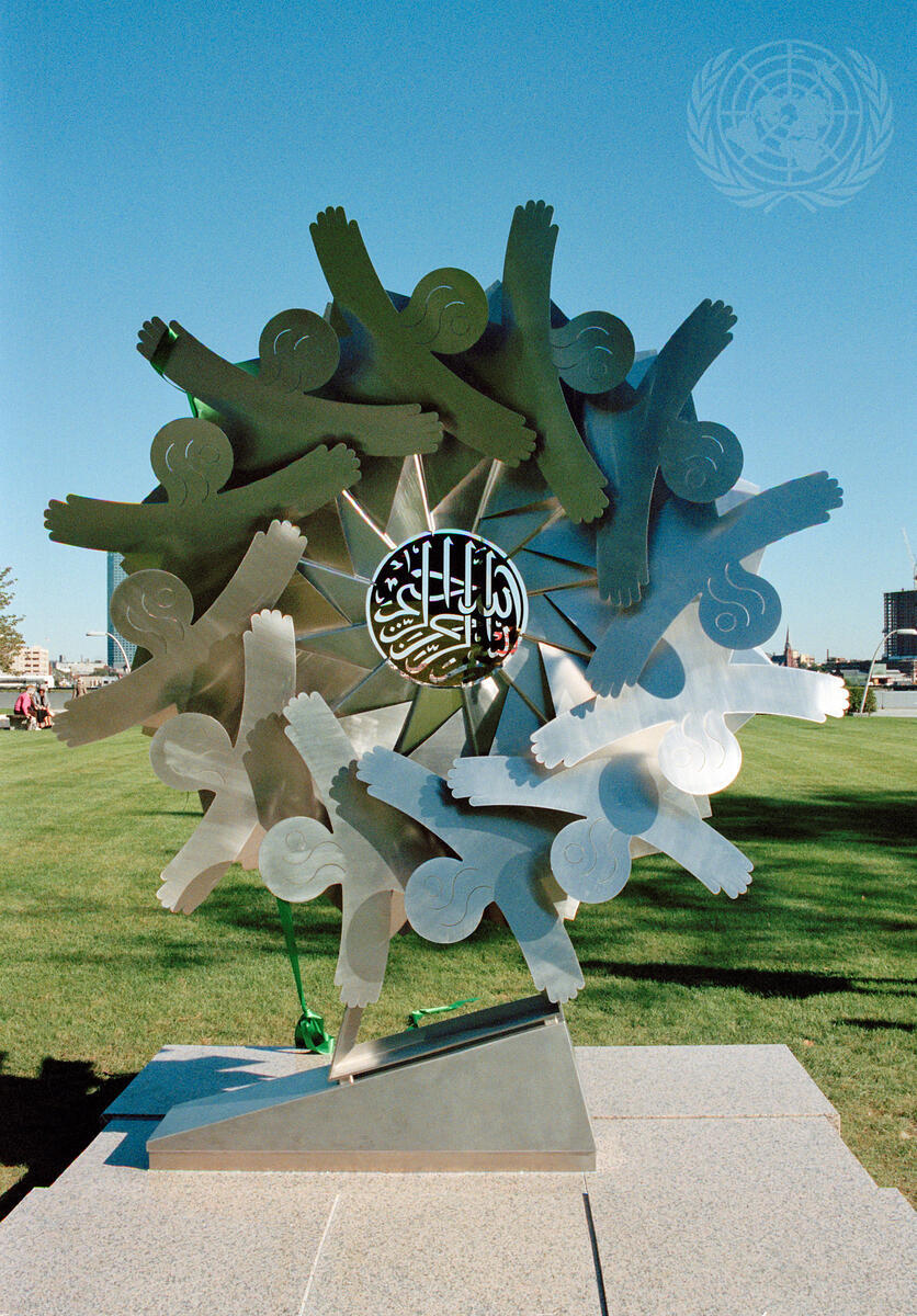A frontal view of the sculpture symbolizing 'sisterhood solidarity' that was presented by Arab women at a special ceremony on the North Lawn today. The sculpture is made of brushed stainless steel, approximately 12 feet high, weighs about 3000 pounds and sits on a pink marble base. It is designed by artist and sculptor Silvio Russo and depicts 12 women holding hands in a synergetic representation of a rising sun.