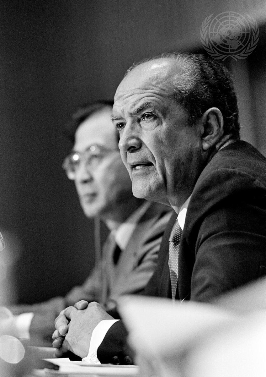 General Assembly President Jorge E. Illueca (Panama) speaking at his first press conference in office. Under-Secretary-General Yasushi Akashi of the Department of Public Information is in background.