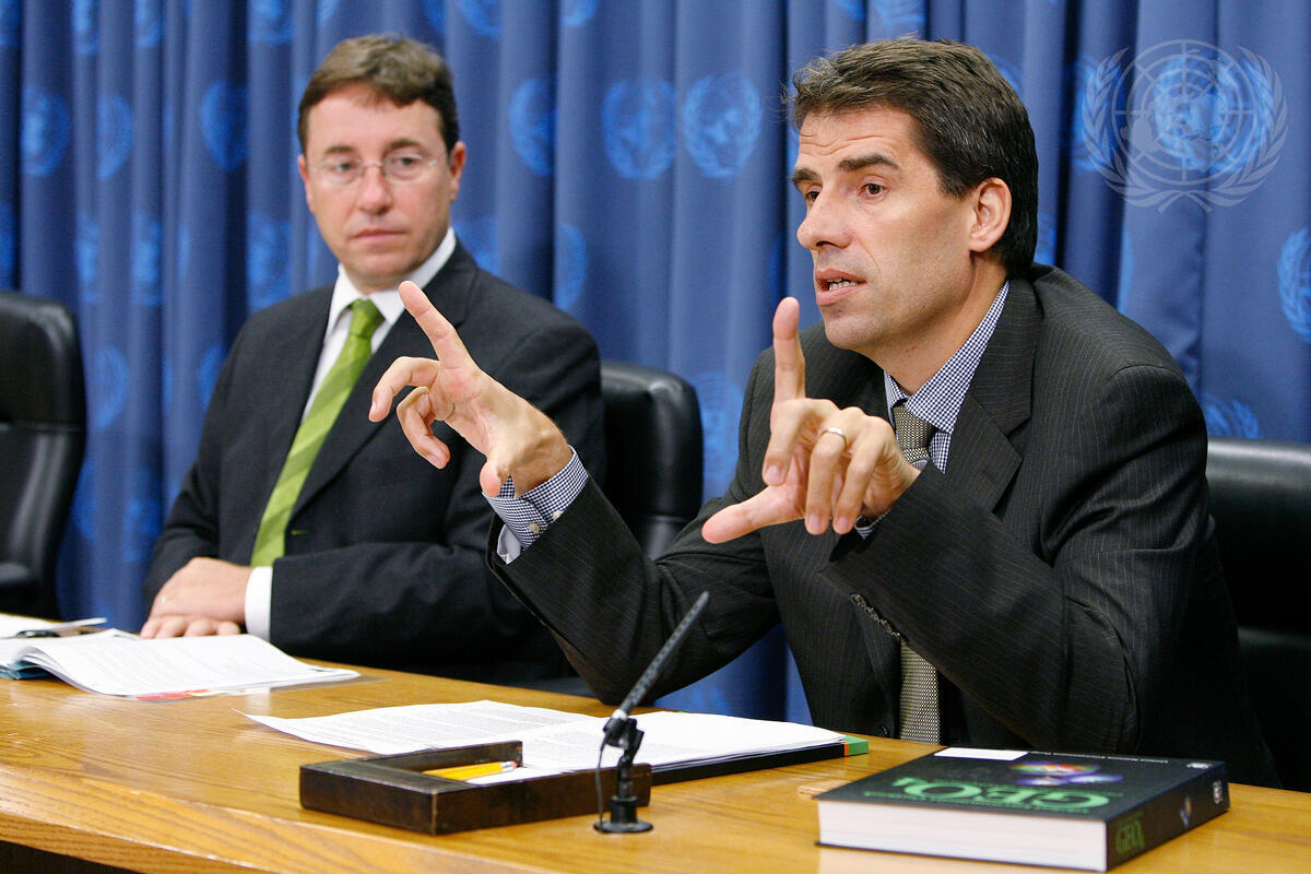Olav Kjørven (right), Director of the Bureau for Development Policy for the United Nations Development Programme (UNDP), flanked by Achim Steiner, Executive Director of United Nations Environment Programme, addresses a press conference on the launch of the 2007 Global Environment Outlook Report, at UN Headquarters in New York.