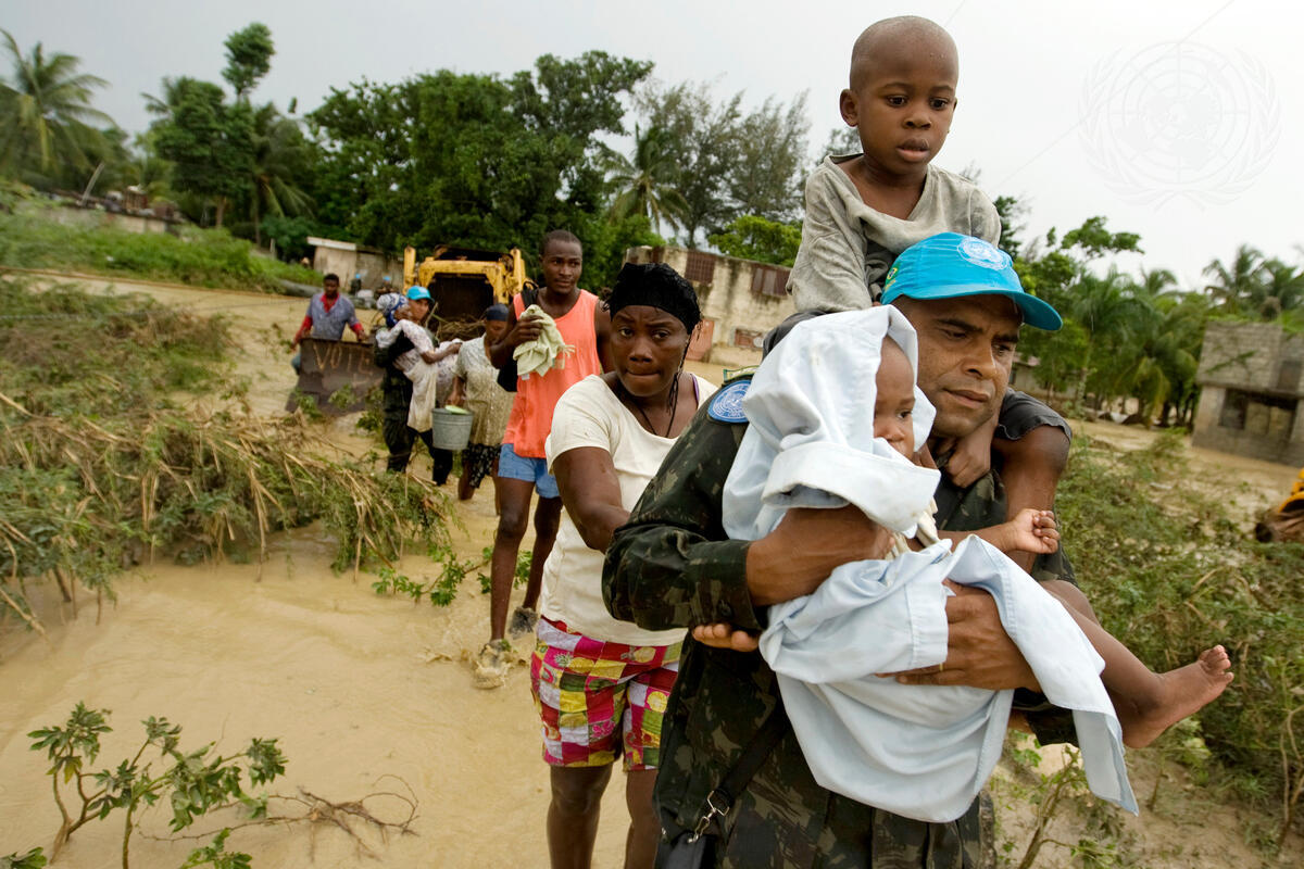 A member of the Brazilian battalion of the United Nations Stabilization Mission in Haiti (MINUSTAH) carries children to safety, as he assists the residents of Cité-Soleil -- one of the many areas ravaged by the heavy rains of tropical storm 'Noel' in Haiti.