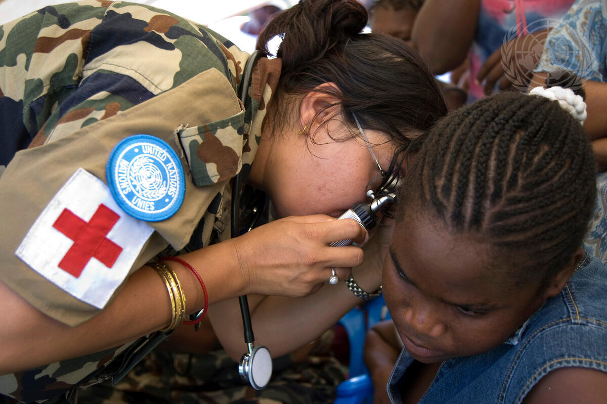 A member of the Nepalese battalion of the United Nations Stabilization Mission in Haiti (MINUSTAH) examines an ear of a young local girl, as part of the activities of the United Nations Day event in Port-Au-Prince, Haiti.