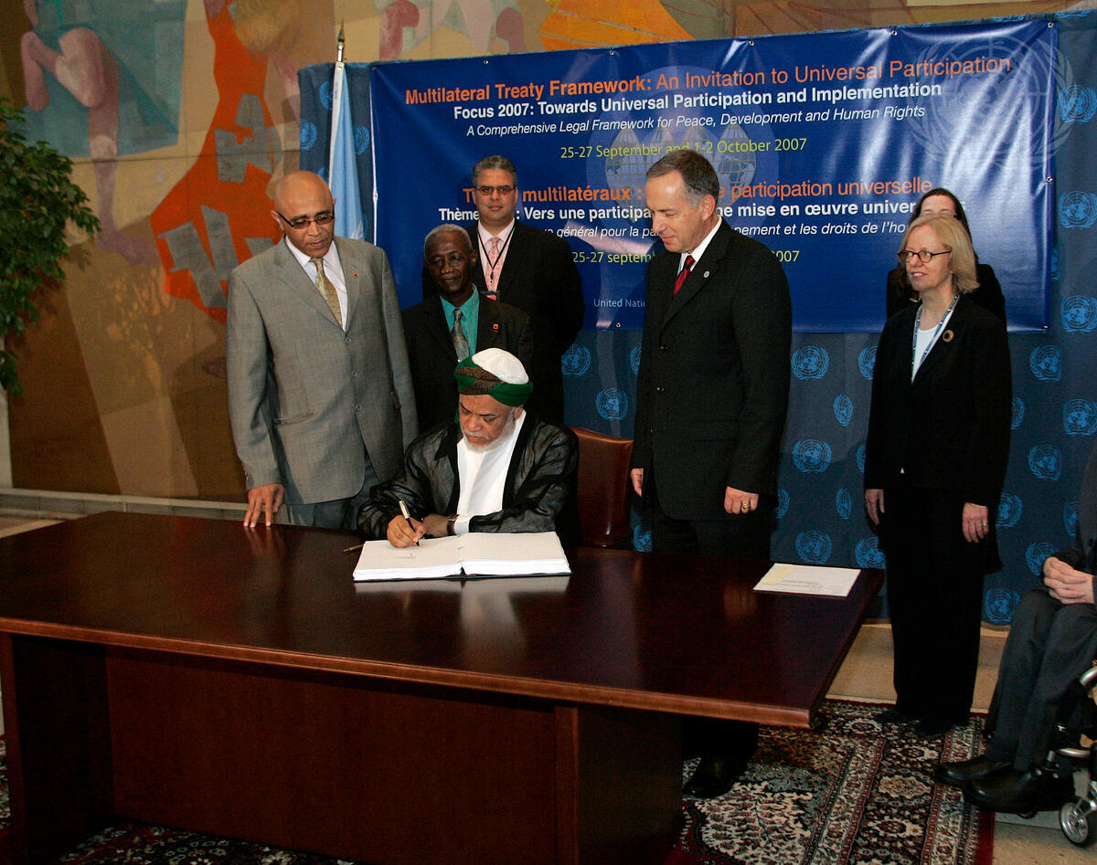 Ahmed Abdallah Sambi, President of the Union of the Comoros, signs the Convention on the Rights of Persons with Disabilities, at UN Headquarters in New York.