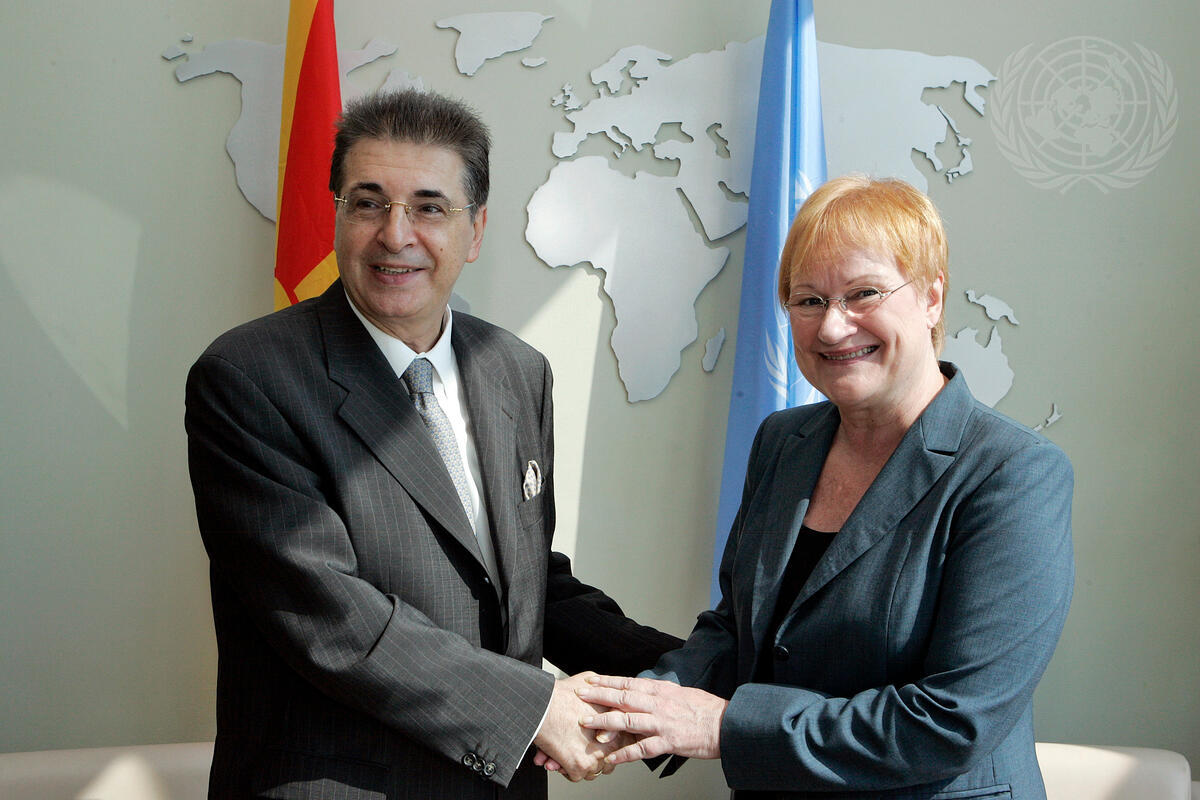Srgjan Kerim (left), President of the sixty-second session of the General Assembly, meets with Tarja Halonen, President of Finland, at UN Headquarters in New York.