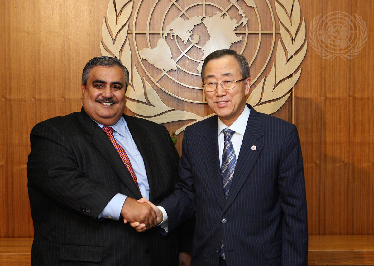 Secretary-General Ban Ki-moon (right) meets with Khalid Bin Ahmed Al-Khalifa, Minister for Foreign Affairs of the Kingdom of Bahrain.