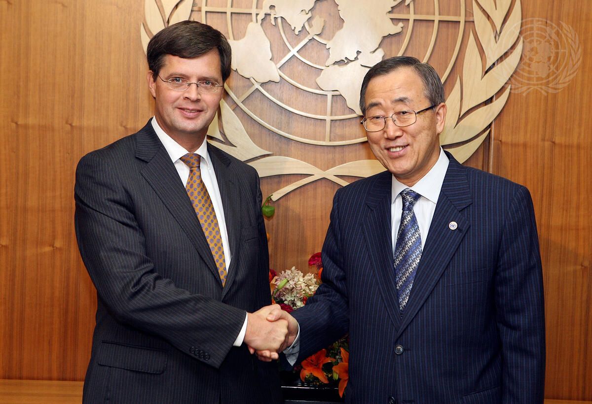 Secretary-General Ban Ki-moon (right) meets with Jan Peter Balkenende, Prime Minister of the Kingdom of the Netherlands.